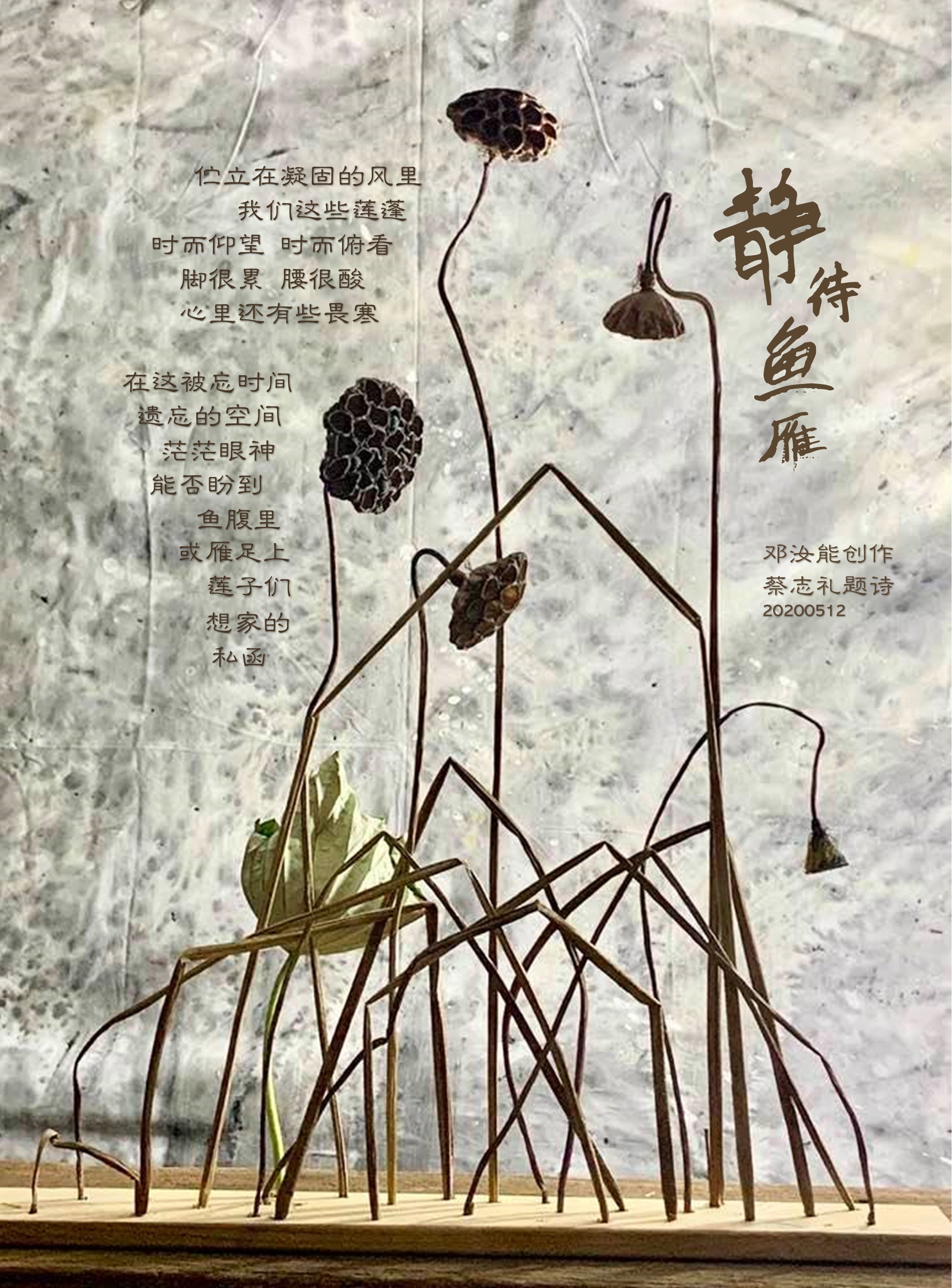 各个姿态的莲蓬展现的肢体语言,传达了强而有力地情感。背景墙斑驳的灰阶图案,与主体融为一体,让时间骤然凝固,生命为之定格。